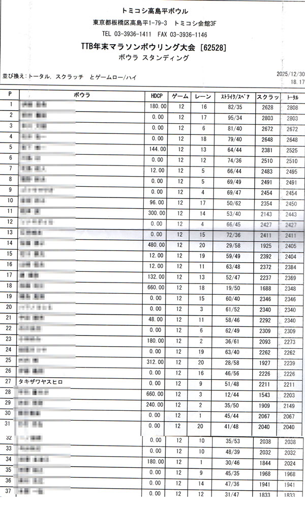 チャレンジ第214戦はトミコシ高島平ボウルでの年末マラソンです。
