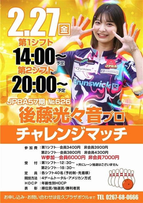 チャレンジ第217戦は、久しぶりな佐久プラザボウルさんで、4ヶ月ぶりの後藤光々音Pです。